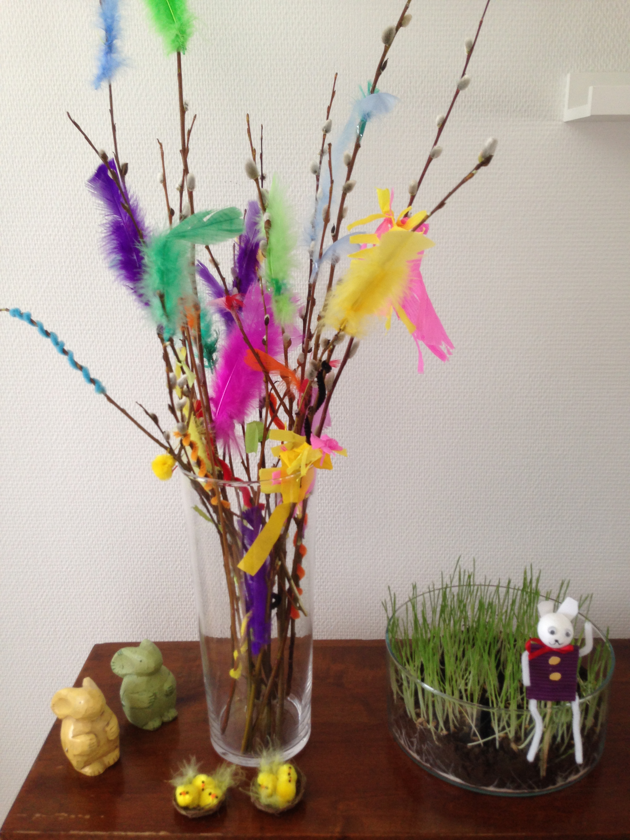 This work starts in the week leading up to Easter, when the children go out to collect Pussy Willow twigs (Pajunkissa) which are just starting to sprout small, fluffy buds. These are then painstaking decorated with coloured pipe-cleaners, feathers, ribbons and small chicks. These will become vital ‘currency’ at the end of the week.