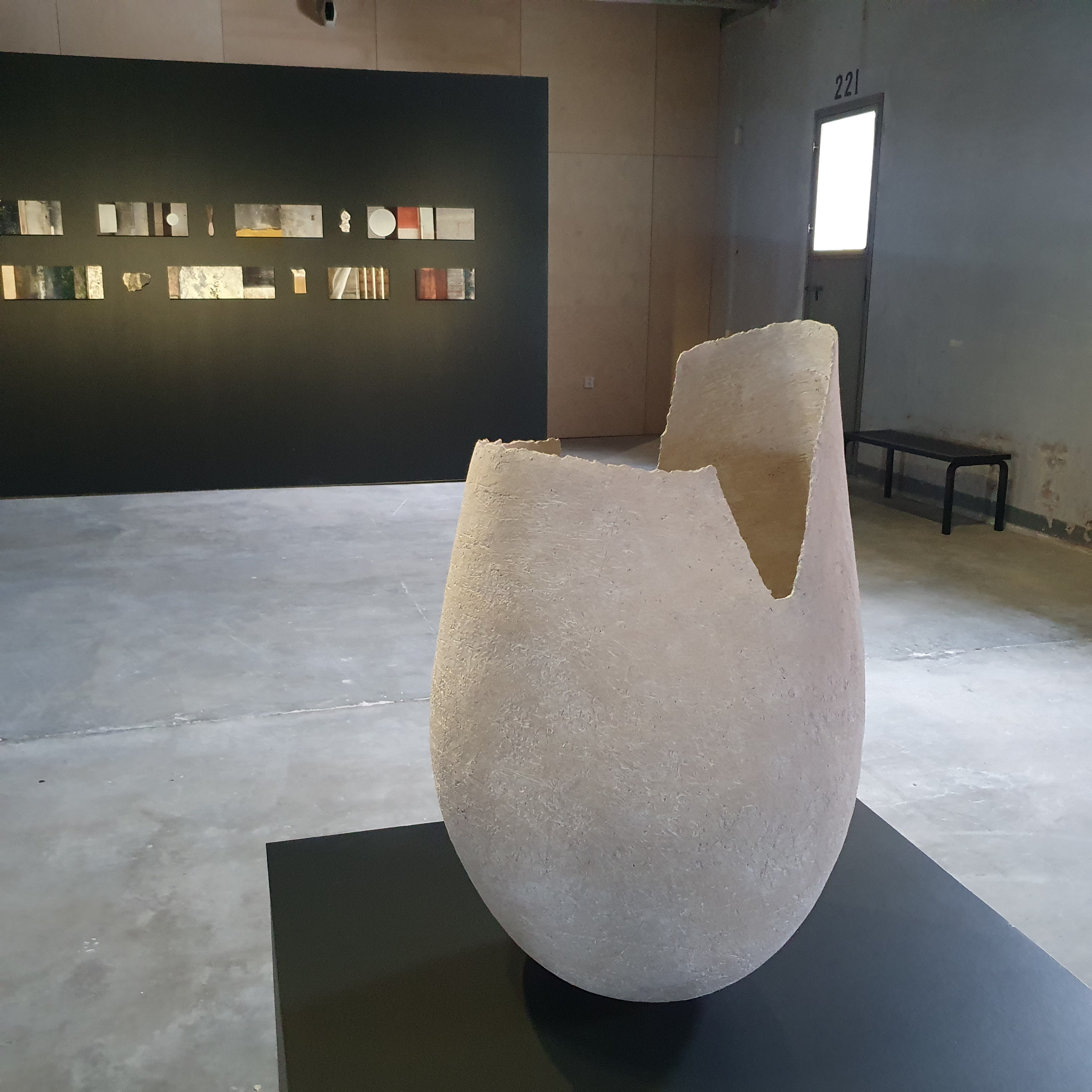 To access the Halli exhibition space, you need to buy a ticket from the info desk at the entrance to the Taito Shop. When you climb the stairs to the second floor (UK: first floor), you need to scan your ticket on the machine and the door opens automatically. Halli is a dark, austere space with a low ceiling and harsh concrete surfaces all around you. The utilitarian look is augmented by the doors spaced at regular intervals along the wall, each one bearing a number from its days as a military warehouse. These, however, also give flexibility to this exhibition hall, both in the size of the exhibits that can be displayed and to the amount of light that can be let into the exhibition.