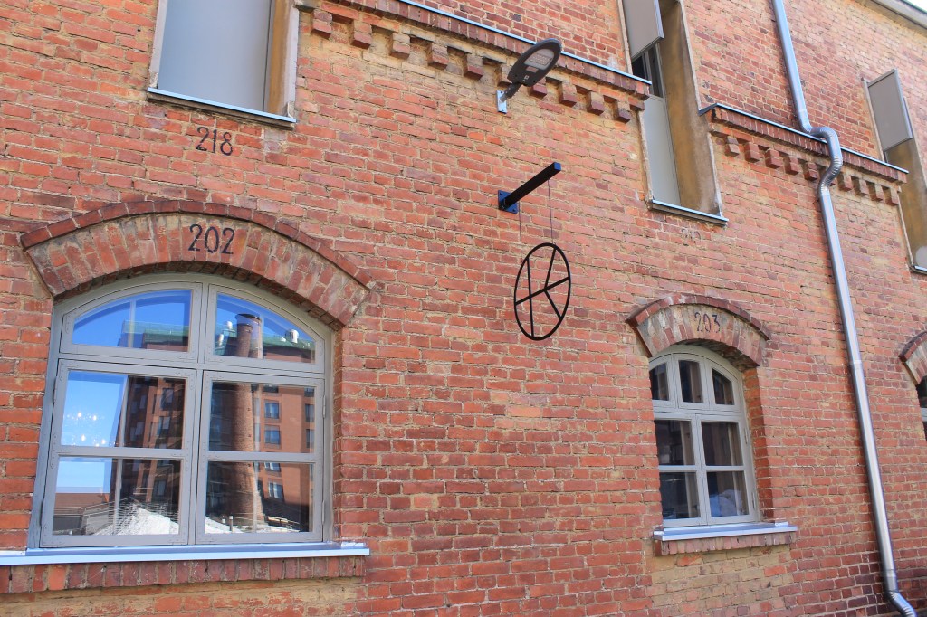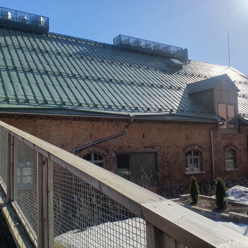 Taking pride of place (not just of Vintti but the entire building) is the large, round window set into the brick wall. It is larger than it appears in the photos and was also the inspiration for teh logo of Kalevan Navetta (see below). When we visited in Springtime, bright daylight was pouring through the window, brightening the room and the exhibition. This only added to the ambiance of the “Stump of Prometheus – Stay together” exhibition (Prometheuksen kanto: Pysykää yhdessä) which combines artwork inspired by nature, with a soundscape created by connecting living plants to electronic equipment to generate an eery atmosphere in this quasi-ecclesiastical setting.